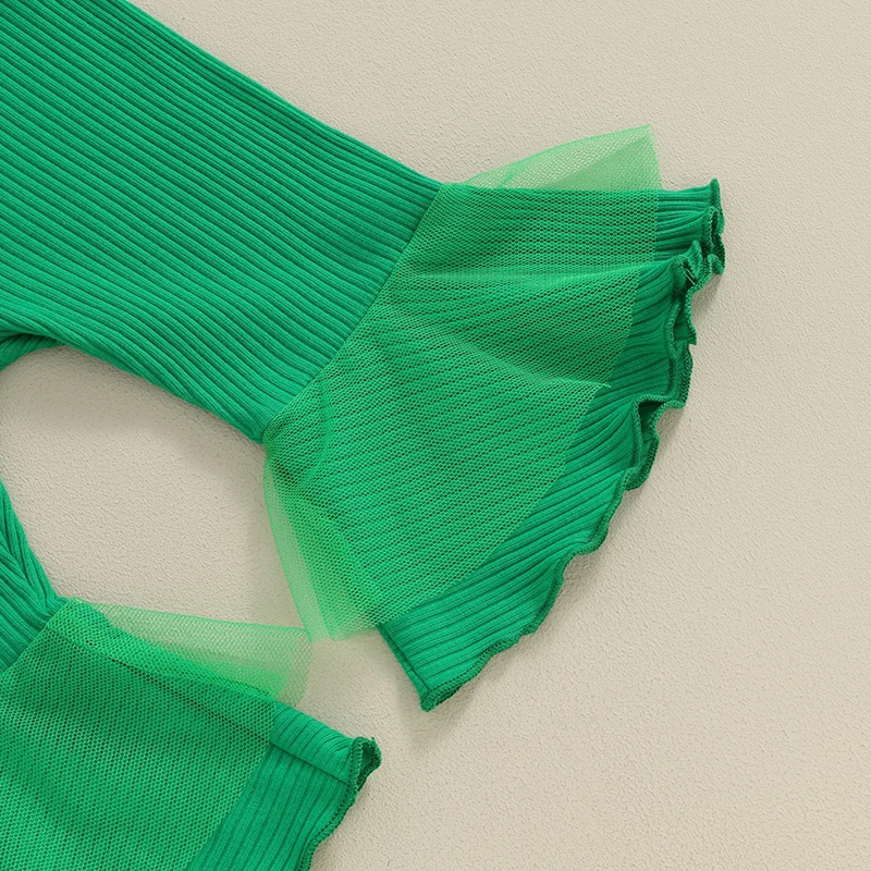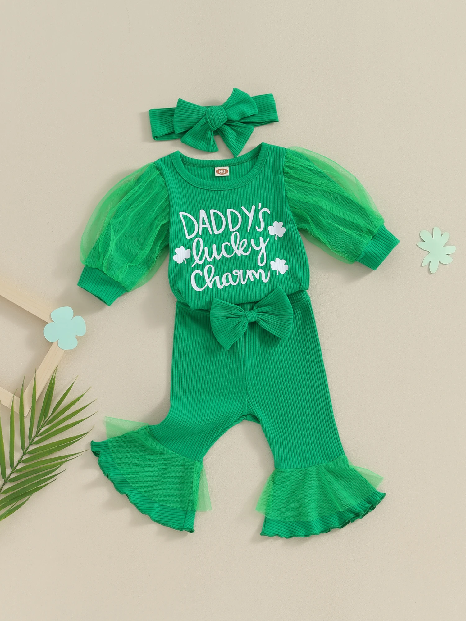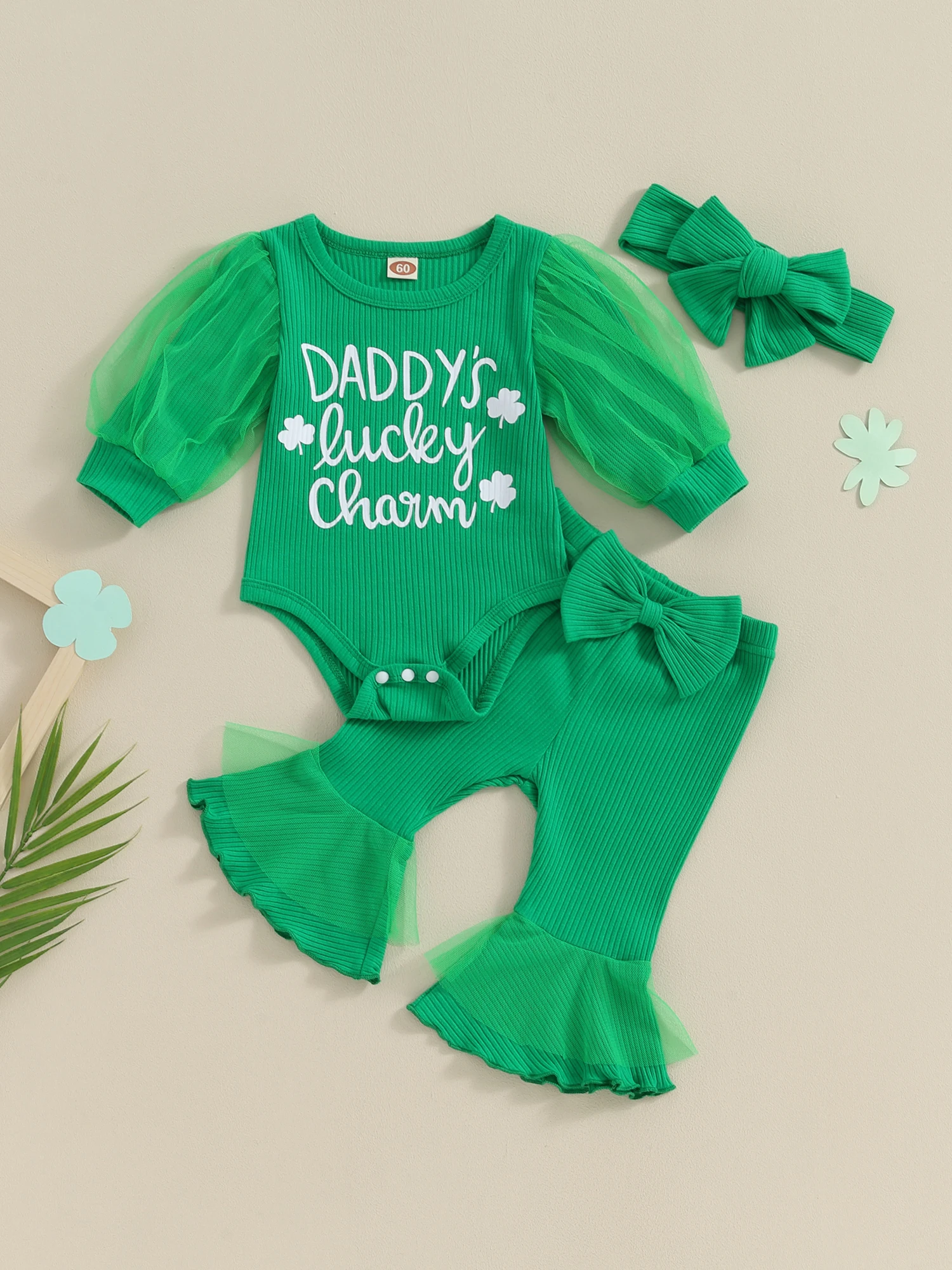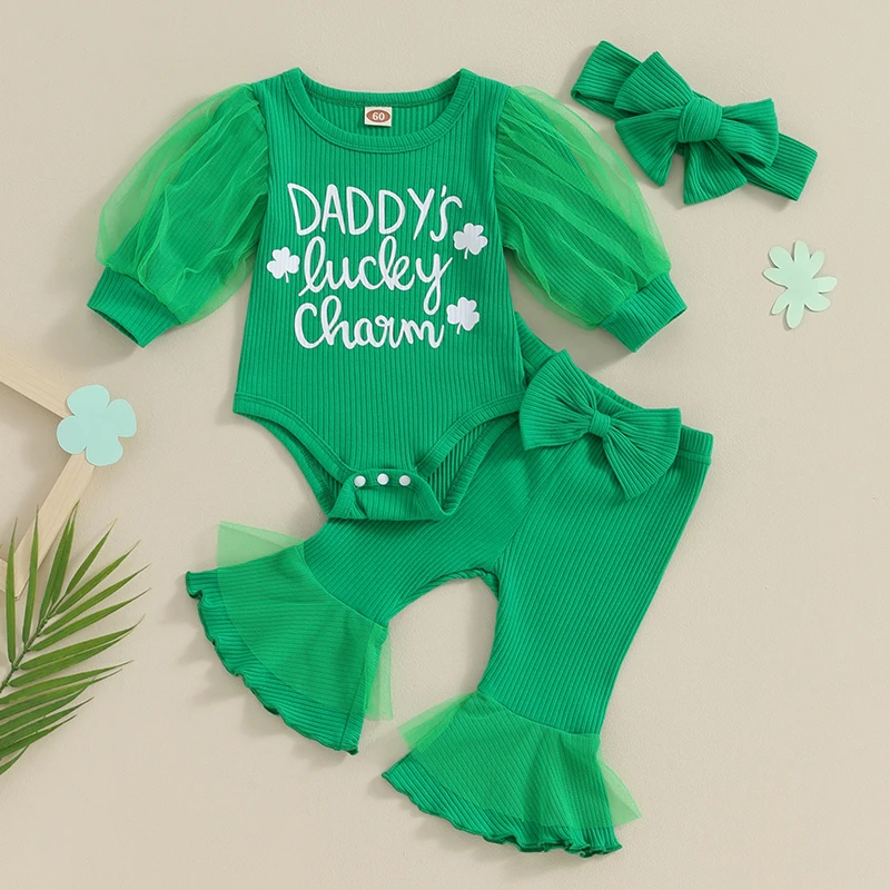 Infant Baby Girl Irish 3 Piece Outfit Long Lantern Sleeve Clover Print Romper + Elastic Waist Flare Pants + Headband Set